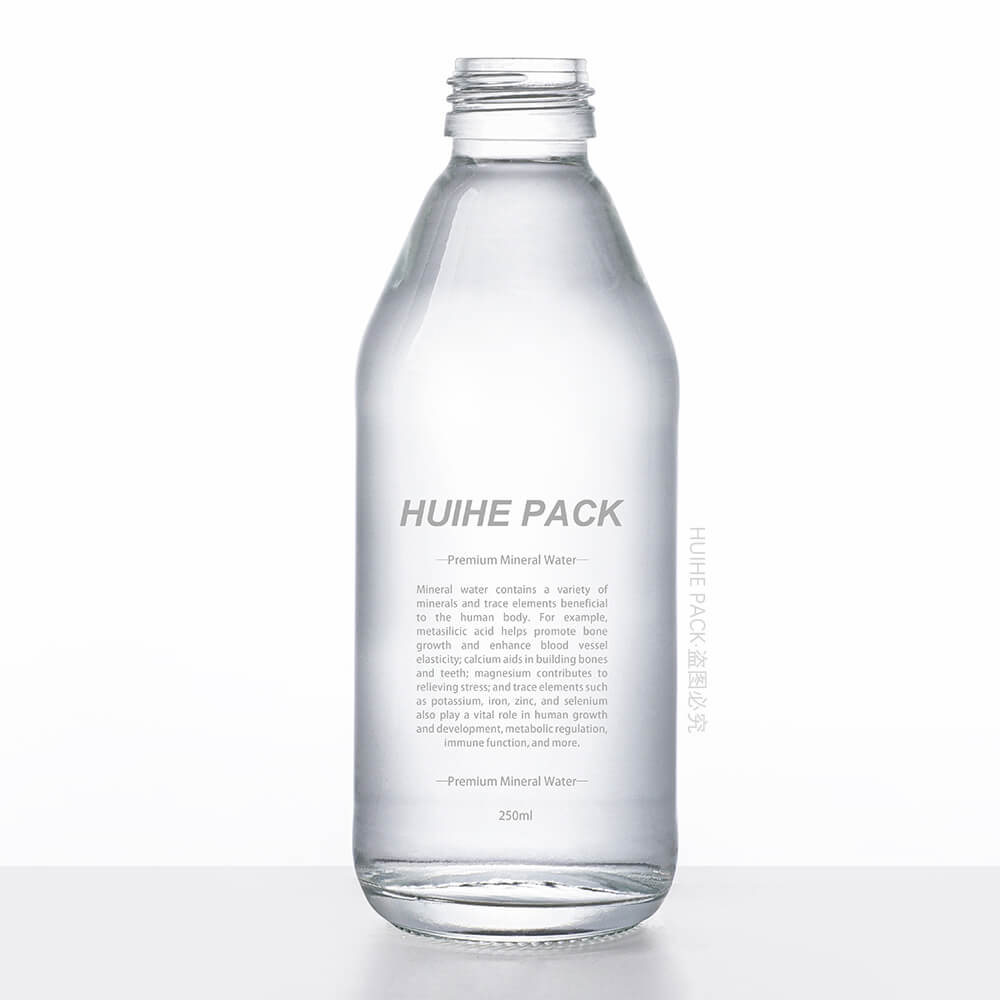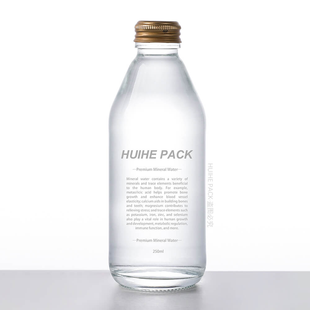 Esta botella de agua de vidrio de 250 ml tiene una forma cilíndrica limpia y estilizada: mide 158 mm de alto con un diámetro de base de 58,3 mm, presenta lados lisos y rectos y un vidrio transparente que brinda una apariencia elegante y moderna, perfecta para marcas de agua mineral de alta gama que buscan un paquete premium minimalista.