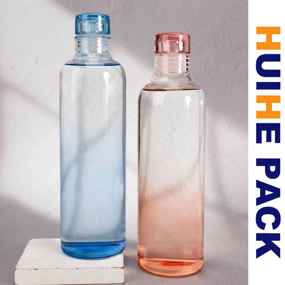 Esta botella de agua de vidrio de borosilicato tiene una forma cilíndrica alargada y elegante, disponible en acabados tintados degradados (transparente, azul, melocotón, gris oscuro) que añaden un toque moderno y elegante. El cuello liso se combina con una gorra teñida a juego para una apariencia cohesiva.