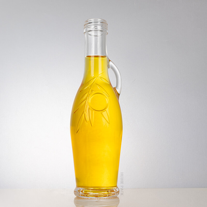 Una característica destacada es el mango del costado, que agrega un toque de singularidad y mejora la usabilidad de la botella. El mango se integra perfectamente en el cuerpo, proporcionando un agarre seguro para verter. Además, la botella está adornada con un intrincado diseño en relieve de hojas y un motivo circular, agregando un elemento de sofisticación y encanto. El cuello largo y delgado se eleva del cuerpo, terminando con una abertura estándar para facilitar el vertido y el tapón, ajustado. Si está buscando 'botellas de licor de vidrio elegantes y prácticas' para mejorar su marca, este diseño es una excelente opción.